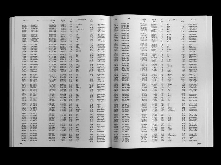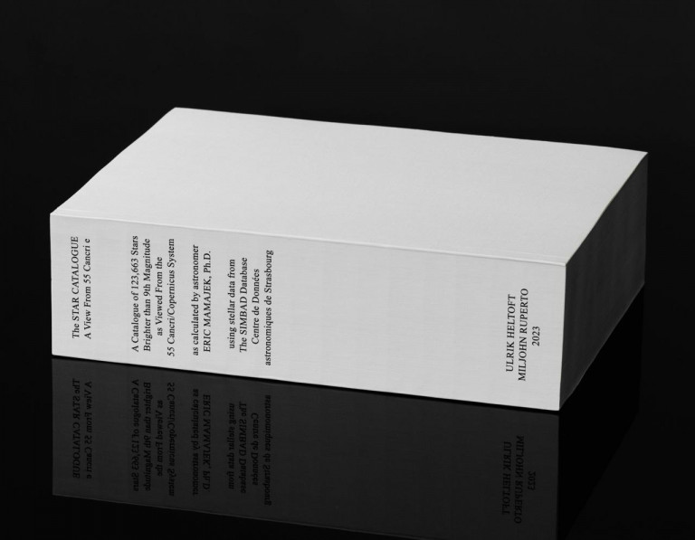 The book — a two-thousand page star catalog, lists the stars in view from 55 Cancri / Copernicus system, along with their coordinates and qualities. The gaze is reversed, and the Sun is dissolved into the visible 123,663 points of light, as seen from Cancri 55e.