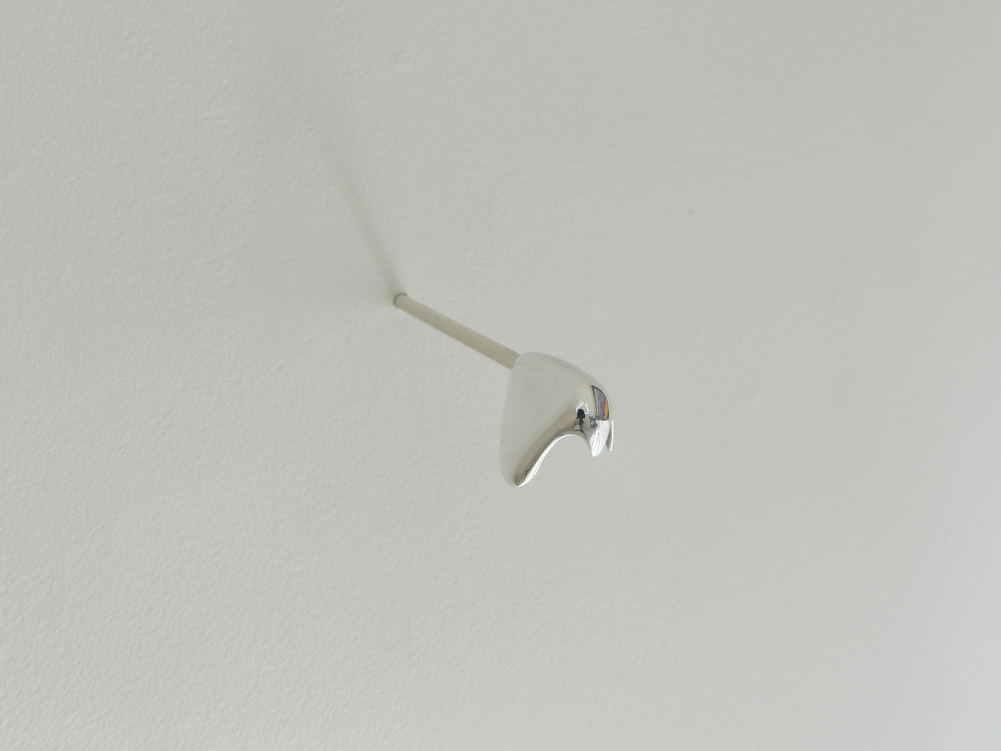 The nose — On the inside it’s a silver negative of the artists nose, capturing its precise texture and conture. The outside — the high polished mirrored warped surface is the vanishing point made physical. space compressed into a tiny gleaming point.
