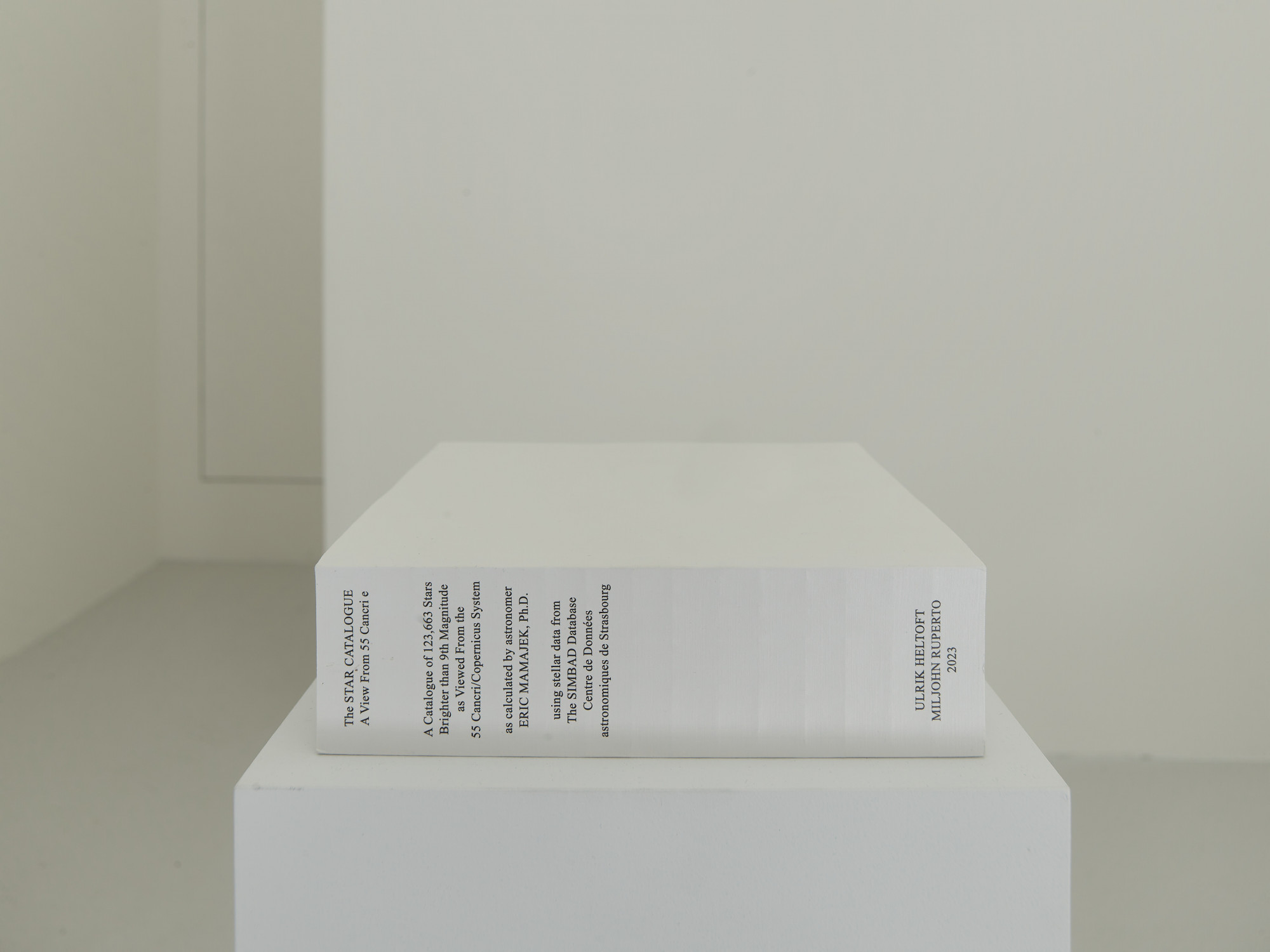 The two artworks in this exhibition picture contradistinctive versions of infinity. The first is a two-thousand-page star catalogue, displayed flat and snugly on a pedestal. The austere and imposing publication was made in collaboration with artist Miljohn Ruperto and charts the positions and qualities of 123,663 stars, as calculated by astronomer Eric Mamajek. While the format of the book mimics that of a standard Star Catalogue, appearing as an unintelligible directory of numerical codes, the artist has shifted its conceptual core. Rather than an earth-centric map, where the sun remains the origin of all coordinates, all the measurements are calculated from the position of 55 Cancri e, an exoplanet 41 light-years away from our solar system. The sidereal account offers a heady transformation of perspective, grounded in a new, but distant center; from this extra-planetary vantage point, we can peer back at the sun while viewing familiar constellations.